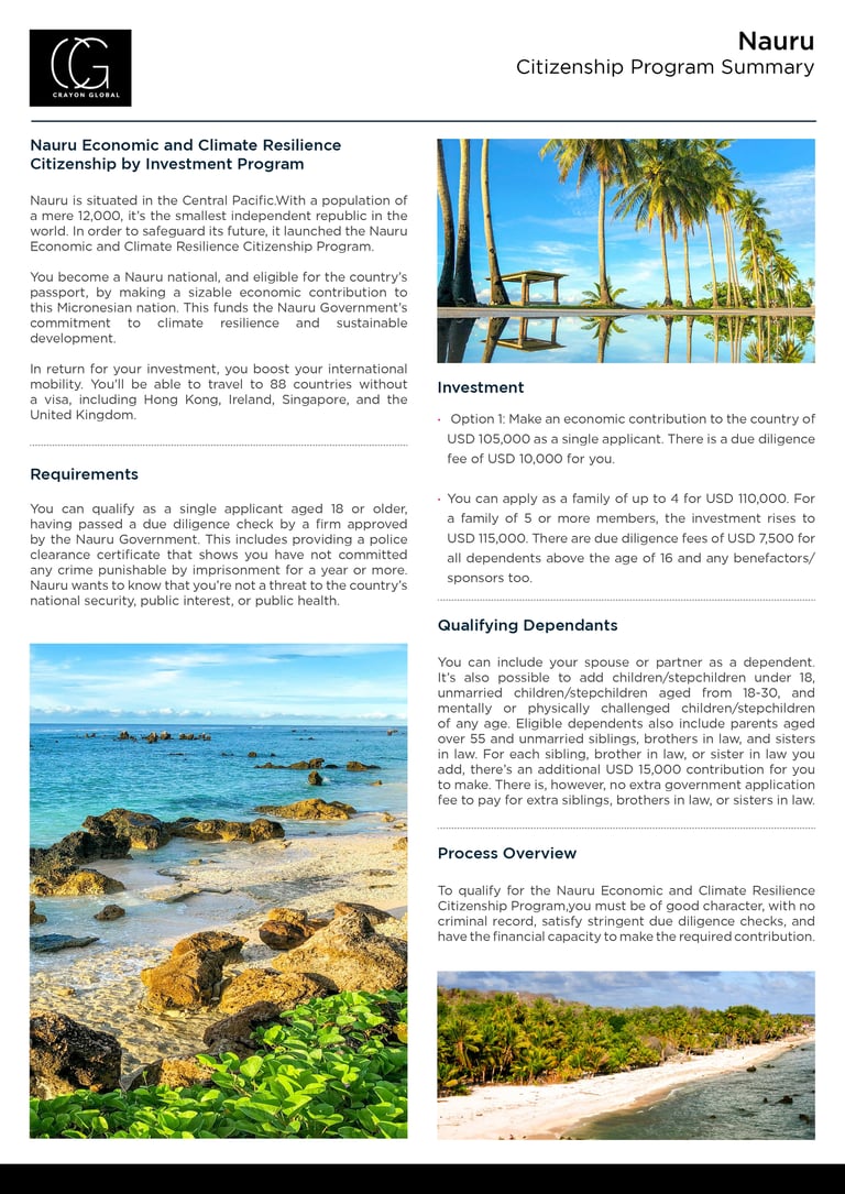 Under the “Economic and Climate Resilience Citizenship Program”, eligible applicants make a non-refundable contribution to Nauru’s development fund, in exchange for full citizenship (no residency requirement).