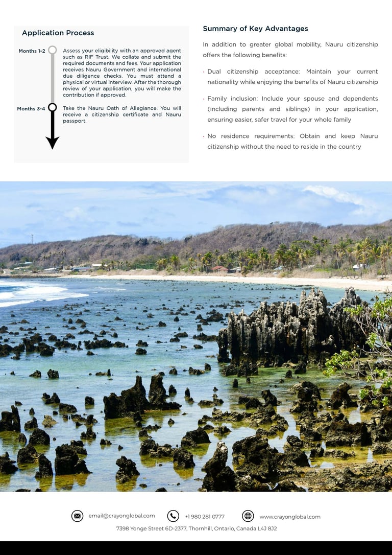 Nauru’s program frames second citizenship as an investment in climate-resilience and economic renewal. A small Pacific island facing existential environmental pressures, Nauru offers a citizenship path for individuals willing to contribute to its future, while gaining a globally respected alternative passport.