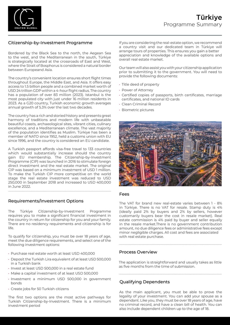 Launched in 2017, Turkey's CBI program was designed to stimulate foreign investment in the country's economy. The program allows foreign nationals to obtain Turkish citizenship by making qualifying investments, primarily in real estate. Since its inception, the program has evolved significantly, particularly in terms of investment thresholds, making it one of the more dynamic citizenship programs globally.