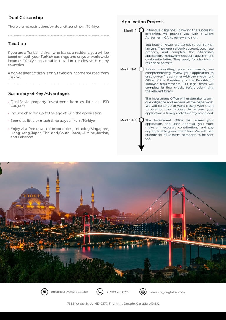 5. Passport Issuance: Once the citizenship application is approved, the investor receives their Turkish passport, typically within four months.